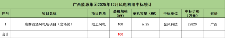 广西能源集团开标项目共1个,总装机规模为100MW,由金风科技1家整机商中标。