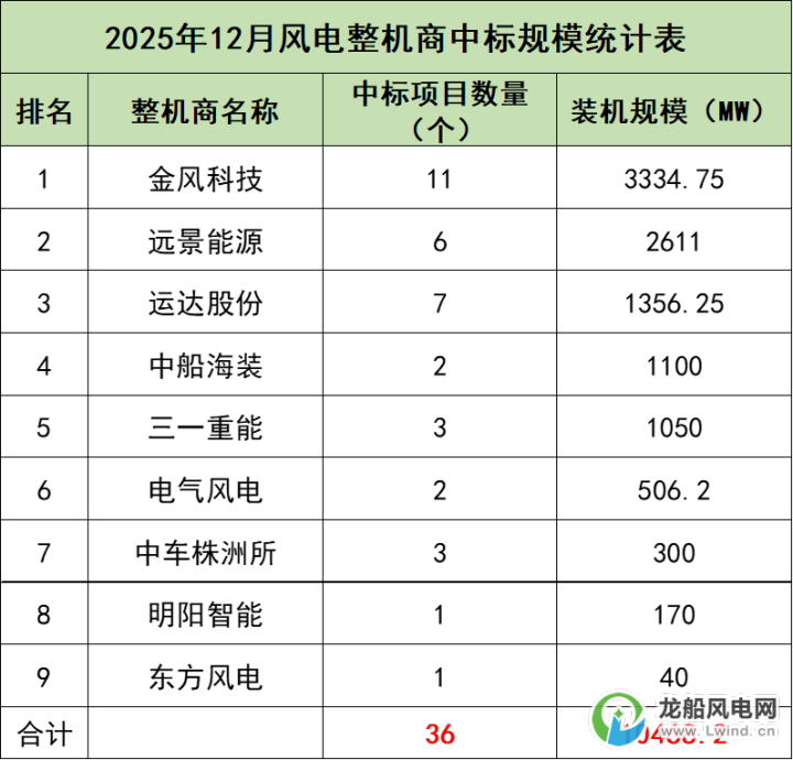2025年12月份,风电项目开标总装机容量共计10468.2MW(不含集采项目),共有9家整机商中标,其中金风科技、远景能源、运达股份中标规模位居前三。