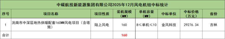 中碳航投新能源集团有限公司开标项目共1个,总装机规模为160MW,由金风科技1家整机商中标。