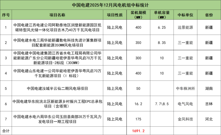 中国电建开标项目共7个,总装机规模为1691.2MW,由远景能源、三一重能、中车株洲所、电气风电、金风科技5家整机商中标。