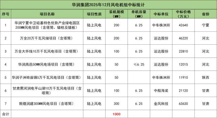 华润集团开标项目共7个,总装机规模为1000MW,由中车株洲所、运达股份、中船海装、金风科技4家整机商中标。
