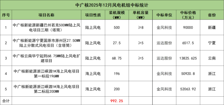 中广核开标项目共5个,总装机规模为992.25MW,由金风科技、运达股份2家整机商中标。