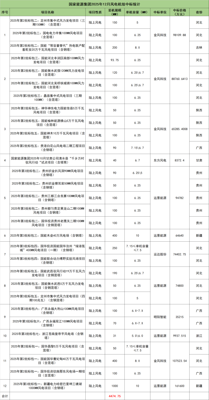国家能源集团开标项目共12个,总装机规模为4474.75MW,由金风科技、东方风电、远景能源、运达股份、明阳智能5家整机商中标。