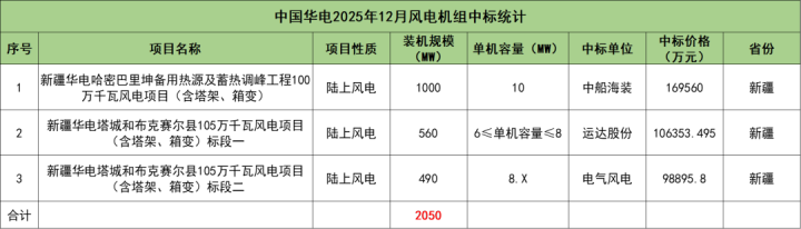 中国华电开标项目共3个,总装机规模为2050MW,由中船海装、运达股份、电气风电3家整机商中标。