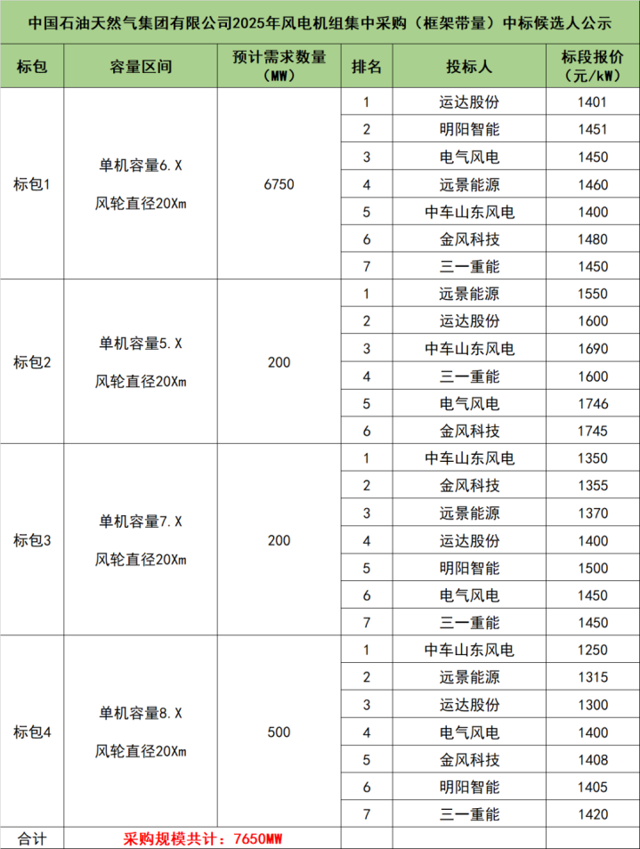 中国石油天然气集团有限公司2025年风电机组集中采购(框架带量)项目采购规模共计7650MW,共4个标包。